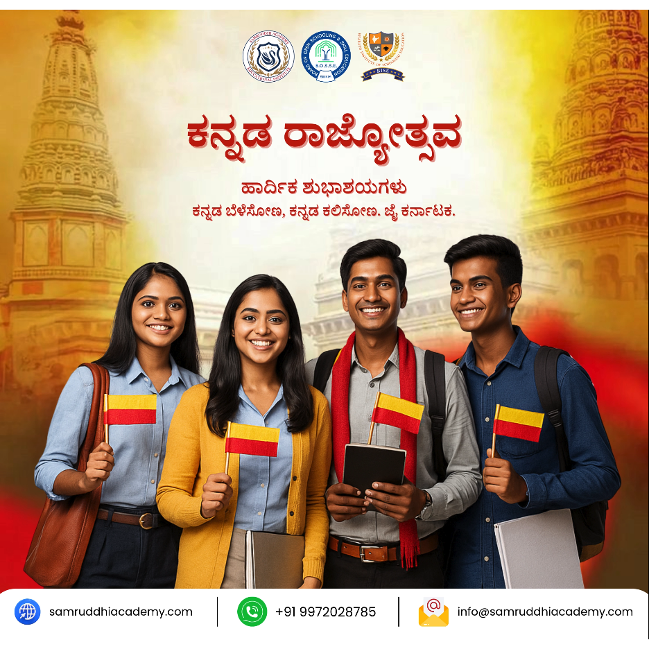 Karnataka Rajyotsava Wishes from Samruddhi Academy From the land of heritage, wisdom, and progress - warm wishes for Karnataka Rajyotsava! At Samruddhi Academy, we celebrate the spirit of Karnataka by nurturing minds, shaping futures, and empowering dreams every day. Bound by the rich legacy of Kannada culture, we open doors to quality education through distance learning, skill development, and teacher training across Hoskote and beyond. Every course, every lesson - designed to honor our roots and uplift the next generation of leaders and achievers in this glorious state. Together, let’s build a brighter tomorrow for Karnataka - where knowledge knows no boundaries and every student can rise. Happy Karnataka Rajyotsava! Team Samruddhi Academy