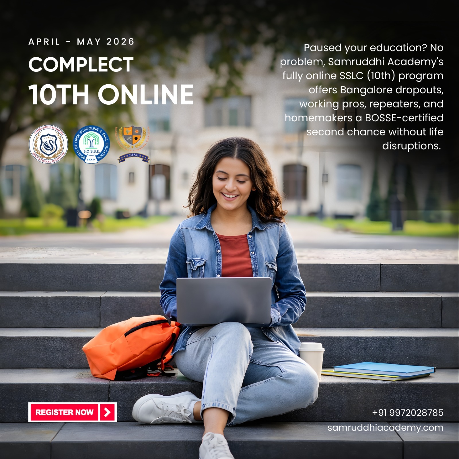 Second Chance Success: Ace Your 10th Online, Your Way! Restart & Rise: Flexible SSLC for Dropouts, Adults & Homemakers Paused your education? No problem, Samruddhi Academy's fully online SSLC (10th) program offers Bangalore dropouts, working pros, repeaters, and homemakers a BOSSE-certified second chance without life disruptions. Self-paced learning with expert mentorship fits jobs, family, or routines, leading to April-May exams and a nationally valid certificate unlocking jobs, diplomas, and futures, all from home comfort. 100% Online Flexibility: Study anytime via app/digital materials; perfect for busy Bangalore schedules. BOSSE/COBSE Approved: Government-recognized diploma equals regular schooling for jobs/IT, /govt exams. Quick Timeline: Enroll now for April 2026 exams; fast-track your career in months, not years. Proven Results: Qualify for PUC, diplomas, promotions, and real stories from homemakers to professionals. Note: Seize your second chance today! Contact Samruddhi Academy in Hoskote, Bangalore, for free counseling, instant enrollment, and April 2026 SSLC admissions. Your brighter future starts with one step. apply now!