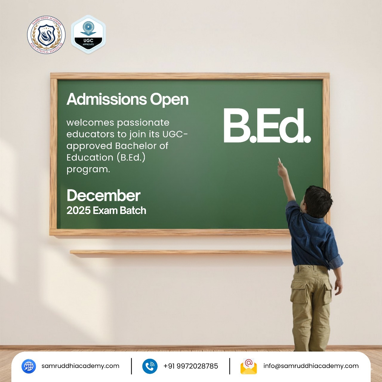 Shape Futures, Teach with Confidence – B.Ed. Admissions Open at Samruddhi Academy for the December 2025 Batch! Are you driven to inspire the next generation and excel in the teaching profession? Samruddhi Academy, Karnataka's trusted name in distance teacher education, welcomes passionate educators to join its UGC-approved Bachelor of Education (B.Ed.) program for the December 2025 exam batch. Why Choose the Samruddhi Academy B.Ed. Distance Program? Officially Recognized & Government-Endorsed: Benefit from a B.Ed. qualification validated by the University Grants Commission (UGC) and recognised by the Government of India, ensuring your eligibility for teaching jobs across public and private schools nationwide. Flexible, Accessible Learning: Complete your B.Ed. in correspondence or distance mode, ideal for working teachers, homemakers, professionals in transition, or anyone balancing studies with personal commitments. Industry-Relevant Curriculum: Master the latest pedagogical methods, classroom management skills, and educational technologies tailored for modern classrooms and career advancement. Eligibility & Easy Enrollment: Open for graduates from any discipline, minimum of 2 years of teaching experience in recognised schools or fresh graduates looking to step into education. Age is no bar. Affordable Fee Structure: Benefit from transparent, competitive tuition fees with options for equated monthly instalments, making top teacher training accessible to all. Government Valid for Promotions & Further Studies: Your B.Ed. from Samruddhi Academy is accepted for government job promotions, private sector roles, MNC placements, and further postgraduate studies. Access to Study Materials & Support: Get comprehensive course materials, guidance from expert faculty, and hassle-free exam arrangements every step of the way. Limited Seats – Apply Today: Maximise your opportunity to enrol and transform your teaching career with Samruddhi Academy’s survey-topping correspondence B.Ed. program. #BedAdmissions #DistanceEducationBed #UGCApprovedBed #TeacherTrainingIndia #CorrespondenceBed #SamruddhiAcademy #GovernmentRecognisedBed #EducationDegreeIndia #BangaloreTeachers #CareerInEducation #BedCorrespondenceCourse #TopBedInstitute #December2025BedBatch